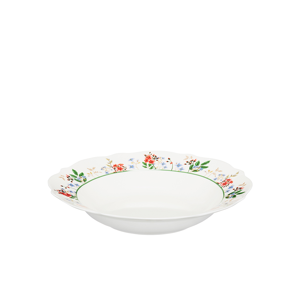 Porcelianinis dubenėlis iš Ambition „Rosalia“ kolekcijos, skersmuo 23 cm, aukštis apie 4 cm, pagamintas iš aukštos kokybės porceliano, dekoruoto subtiliu gėlių raštu pagal „Rosalia“ dizainą. Toks dubenėlis puikiai tinka sriuboms, salotoms, užkandžiams ar desertams, taip pat dera kaip dalis vieningos stalo servizo kompozicijos. Porcelianas užtikrina patvarumą ir atsparumą kasdieniam naudojimui, o gaminį galima plauti indaplovėje ir naudoti mikrobangų krosnelėje, todėl jis praktiškas tiek kasdienėje virtuvėje, tiek ypatingoms progoms.