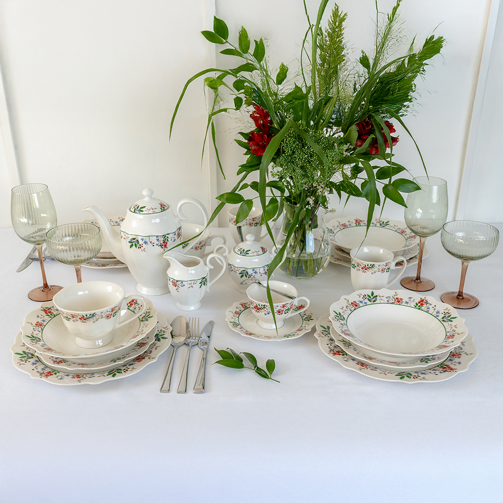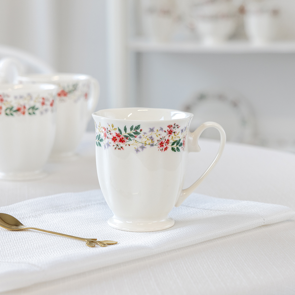 Porcelianinis puodelis „Rosalia“ iš Ambition – elegantiškas 300 ml talpos gėrimų indas, pagamintas iš aukštos kokybės porceliano, kuris yra atsparus kasdieniam naudojimui ir malonus liesti. Puodelis dekoruotas romantišku gėlių (Rosalia) raštu su subtiliomis raudonų žiedų ir žalių lapų detalėmis, suteikiančiomis klasiką primenantį ir estetišką vaizdą ant stalo. Forma siaurėjanti žemyn su šiek tiek platėjančia viršutine dalimi ir dekoratyvine pėdele padaro puodelį patogų naudoti ir vizualiai lengvą. Puodelis tinka tiek karštiems, tiek šaltiesiems gėrimams (pvz., kavai ar arbatai), galima plauti indaplovėje ir naudoti mikrobangų krosnelėje, kas užtikrina praktiškumą kasdienai.