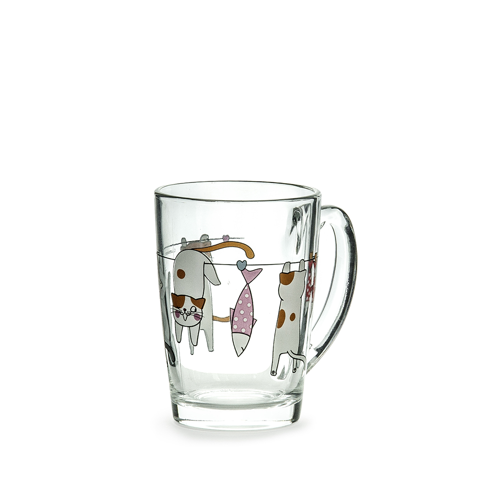 Stiklinis puodelis „Katės“ iš Luminarc New Morning kolekcijos, talpa 320 ml, pagamintas iš grūdinto, karščiui ir smūgiams atsparaus stiklo. Modelis išsiskiria žaismingu katės motyvu, kuris suteikia puodeliui savito charakterio ir ypač patiks gyvūnų mylėtojams. Puodelis tinkamas tiek karštiems, tiek šaltiesiems gėrimams (kavai, arbatai ar sultims), ir yra galimas plauti indaplovėje bei naudoti mikrobangų krosnelėje. Universalus dizainas dera prie kasdienio stalo serviravimo ir kasdienio naudojimo.