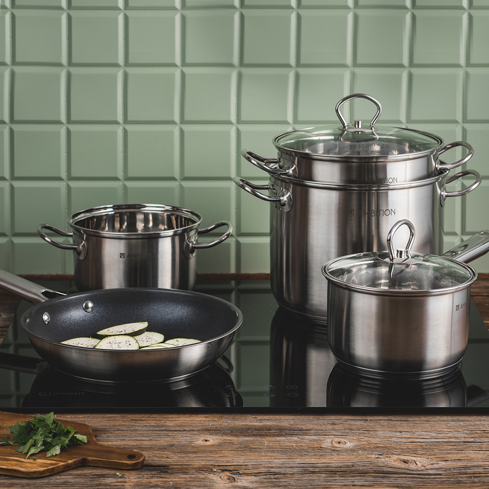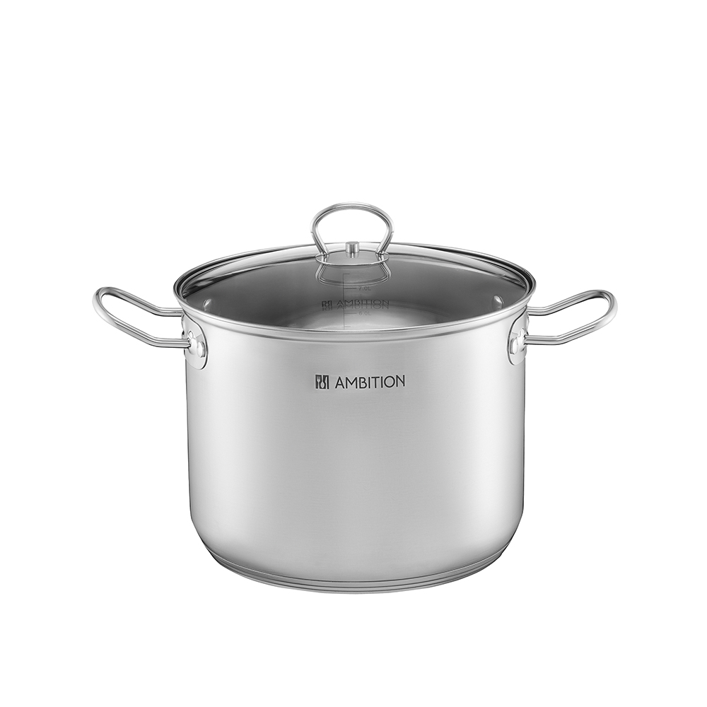 Didelio tūrio puodas Ambition „Acero“ su stiklo dangčiu, pagamintas iš nerūdijančio plieno. Turi klasikinę, aukštesnę formą, todėl ypač tinka sriuboms, troškiniams ir didesniems patiekalams. Vidinė sienelė pažymėta talpos matuokliu, kas palengvina skysčių dozavimą gaminimo metu. Puodas tinka visų tipų viryklėms, įskaitant indukcines, ir yra galimas plauti indaplovėje, todėl praktiškas kasdieniai virtuvės naudojimui.