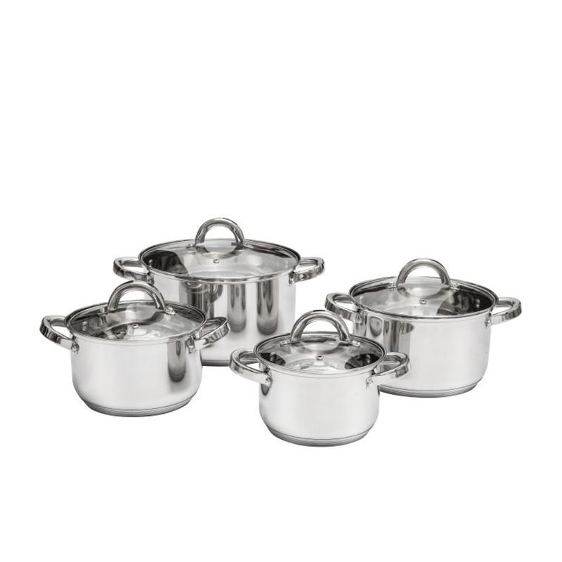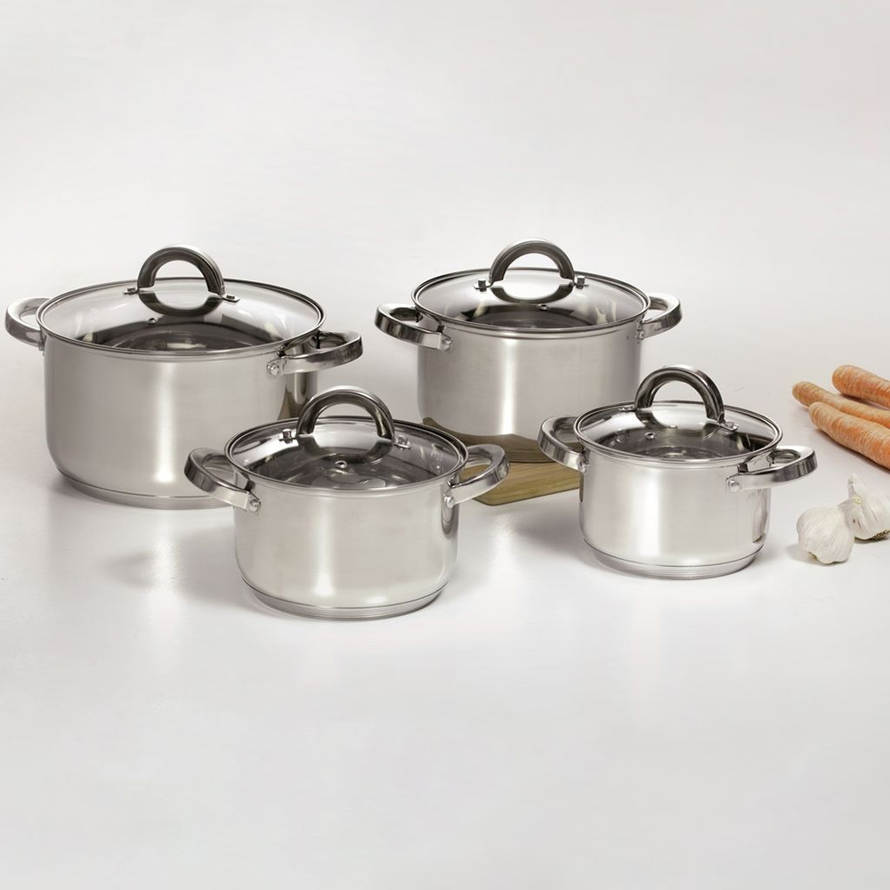 Storos, suapvalintos Belly tipo (0,5 mm) sienelės ir daugiasluoksnis dugnas (5 mm plienas + 1,5 mm aliuminis + 0,5 mm plienas) garantuoja tolygų ir greitą puodo įkaitimą. Pagaminti iš geros kokybės nerūdijančio plieno, komplekte yra atitinkami grūdinto stiklo dangčiai ir patogios rankenos, pritvirtintos kniedėmis. Ant kiekvieno puodo vidinių sienelių yra skalė, kuri palengvina skysčių matavimą. Galima plauti indaplovėje, tinka visų tipų viryklėms, įskaitant indukcines. Komplektas žavi savo modernia ir elegantiška forma, su veidrodine apdaila.
