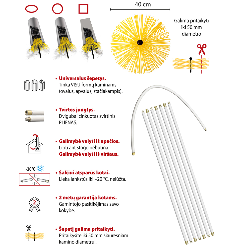 Rinkinys kamino valymui šepetys nailoninis D40 cm, kotai 6 vnt. po 1 m ilgio