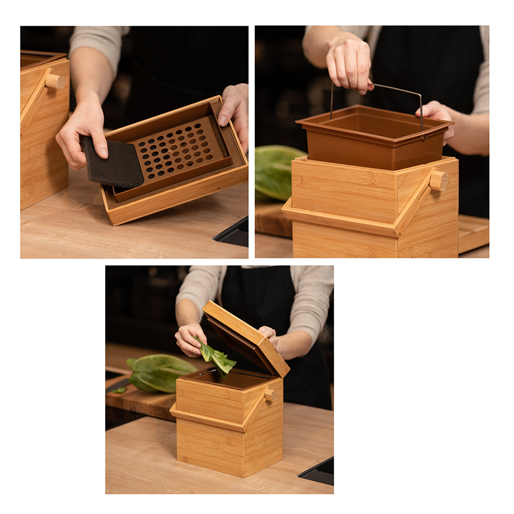 Elegantiškas virtuvinis kompostavimo indas su dangčiu – puikus pasirinkimas tiems, kurie nori kompostuoti patogiai ir estetiškai. Jo modernus dizainas sklandžiai įsilieja į virtuvės interjerą ir atrodo kaip stilinga akcentinė detalė ant stalviršio. Tai praktiška ir diskretiška alternatyva dideliems komposto kibirams.