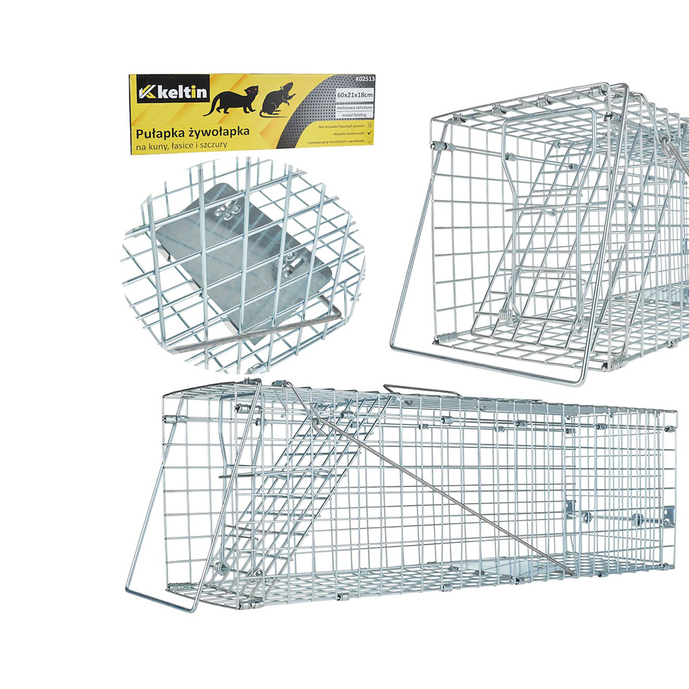 Efektyvūs ir augintiniams saugūs gyvi spąstai, kurių matmenys yra 60x21x18 cm, idealiai tinka gaudyti nepageidaujamus svečius, tokius kaip kiaunės, žebenys ir žiurkės. Pagaminti iš patvaraus cinkuoto plieno, jie yra atsparūs oro sąlygoms ir ilgaamžiai. Sulankstomas mechanizmas leidžia patogiai laikyti ir transportuoti.